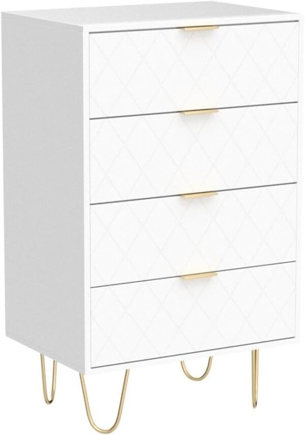 Delicate metal legs and luxurious gold pull handles add appealing detail to this modern dresser, adaptable to any style and creating a spacious look. The storage combination has 4 drawers to neatly organize items by type, meeting all storage needs. This dresser serves as an exquisite ornament, suitable for office, bedroom, and kitchen use. Made of eco-friendly MDF board, it’s durable, water-resistant, and scratch-resistant. Smooth slide rails and handles ensure convenient daily use. Equipped with anti-tip anchoring hardware for stability. Easy assembly with clear instructions and marked parts included. Dimensions approximately 29 cm D x 60 cm W x 91 cm H.