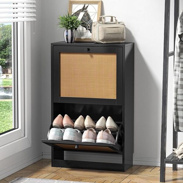 Crafted from sturdy MDF wood and natural hand-woven rattan, this eco-friendly shoe cabinet brings a natural touch to your home. Its slim design fits perfectly into narrow entryways or corners, ideal for small apartments or dorms. Measuring approximately 51 cm L x 23 cm D x 84 cm H, this cabinet features 2 flip drawers that can store 8-10 pairs of shoes with adjustable internal shelves. The pull-down drawers make this cabinet perfect for narrow entryways. Equipped with an anti-tipping device, it can be securely fixed to the wall for added safety. Easy assembly with tools and clear instructions included. Contact us with any issues. Note: Attach the cabinet to the wall using the provided anti-tip kits. Adjust hinge screws as per manual if doors appear uneven.